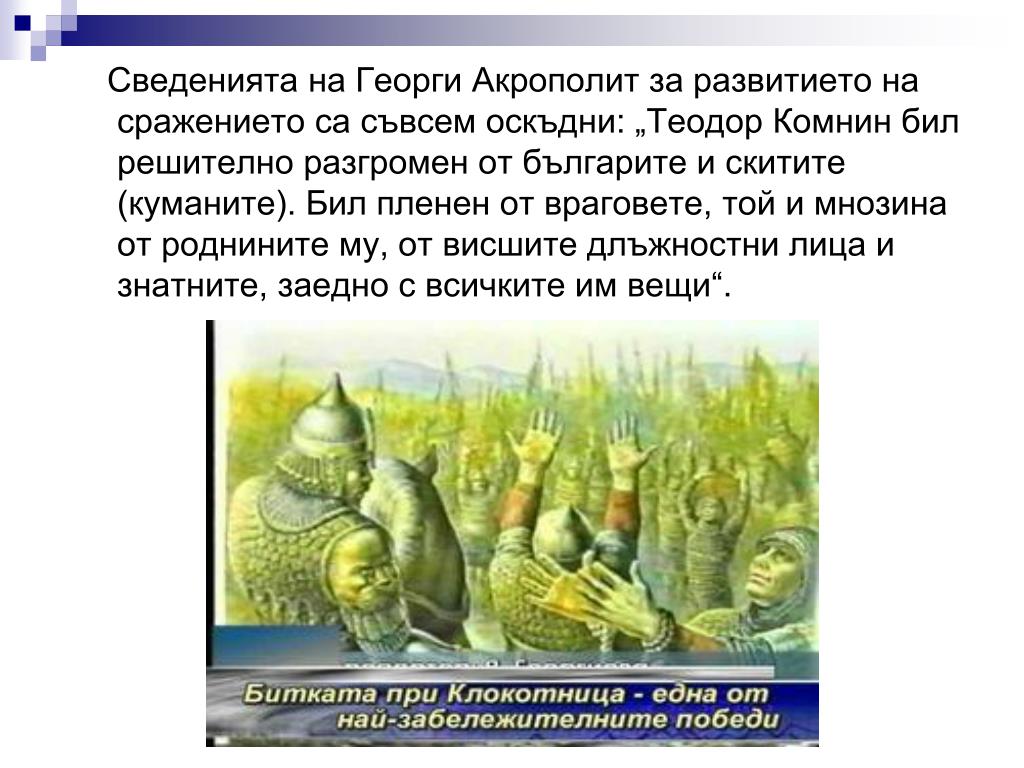 Сведенията на Георги Акрополит за развитието на сражението са съвсем оскъдни: „Теодор Комнин бил решително разгромен от българите и скитите (куманите). Бил пленен от враговете, той и мнозина от роднините му, от висшите длъжностни лица и знатните, заедно с всичките им вещи“.