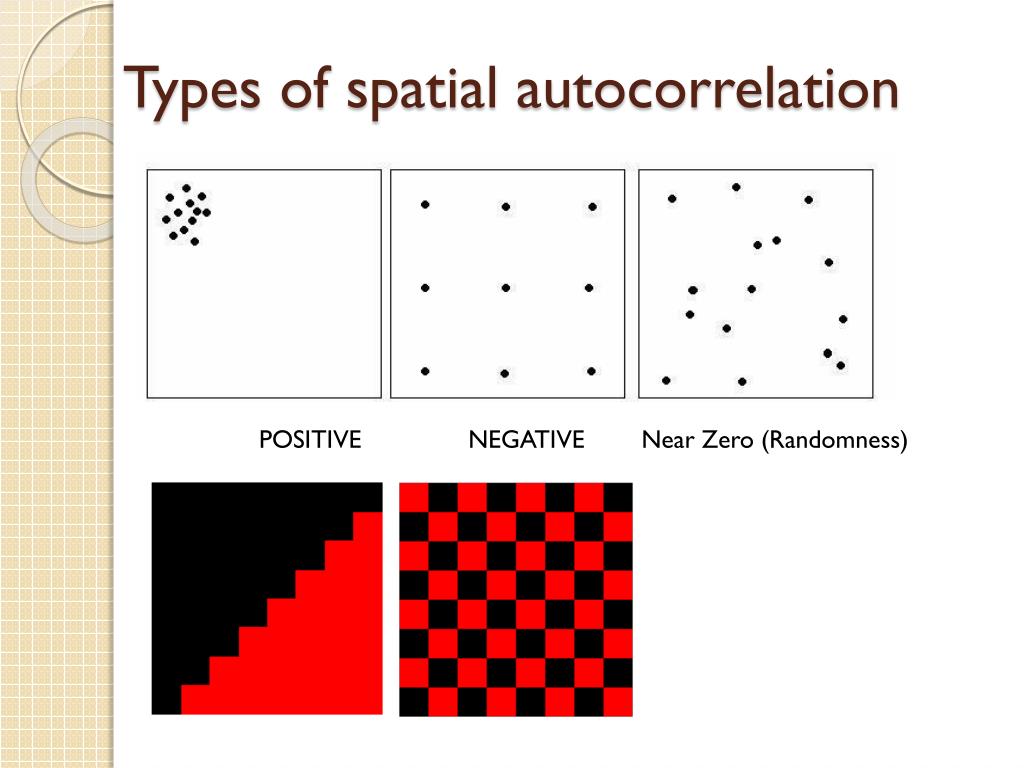 Types of spatial autocorrelation POSITIVE NEGATIVE Near Zero (Randomness)
