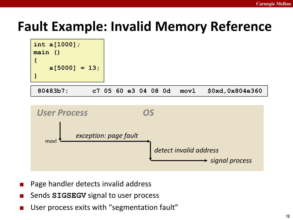 Fault Example: Invalid Memory Reference int a[1000]; main () { a[5000] = 13; } • Page handler detects invalid address • Sends SIGSEGV signal to user process • User process exits with “segmentation fault” 80483b7: c7 05 60 e3 04 08 0d movl $0xd,0x804e360 User Process OS exception: page fault movl detect invalid address signal process