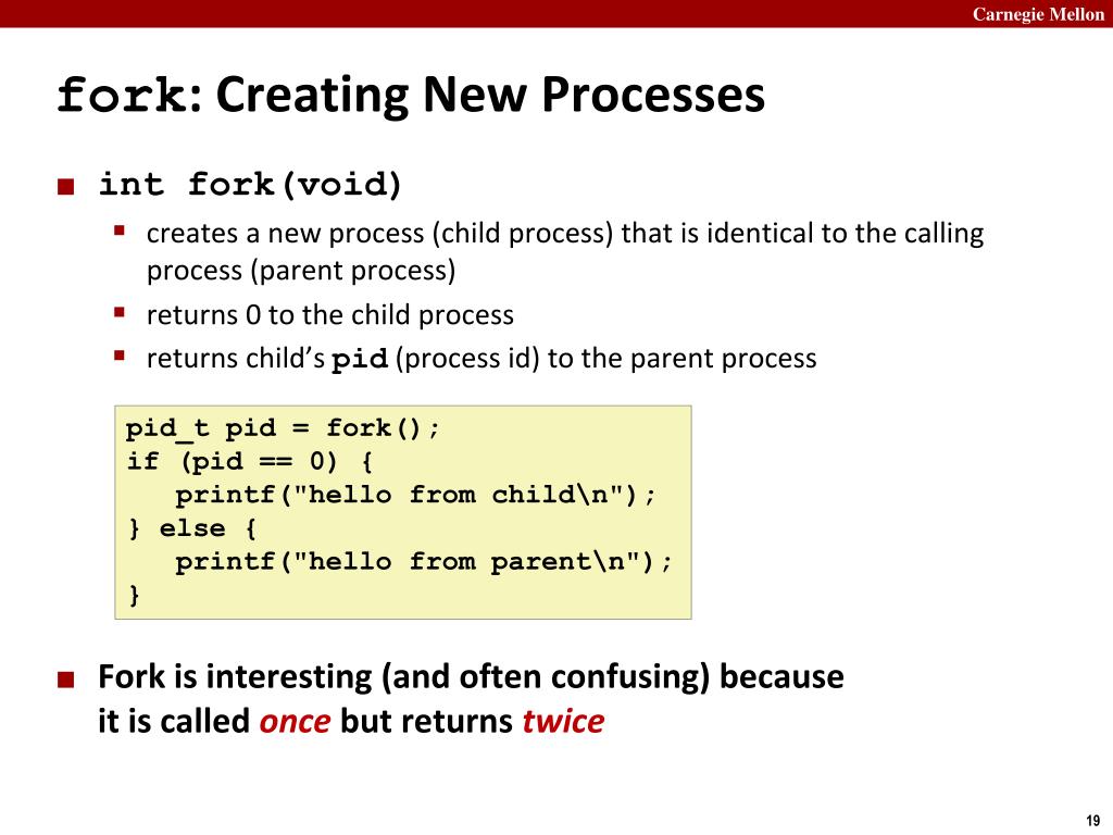 fork: Creating New Processes • int fork(void) • creates a new process (child process) that is identical to the calling process (parent process) • returns 0 to the child process • returns child’s pid (process id) to the parent process • Fork is interesting (and often confusing) because it is called oncebut returns twice pid_tpid = fork(); if (pid== 0) { printf("hello from child\n"); } else { printf("hello from parent\n"); }