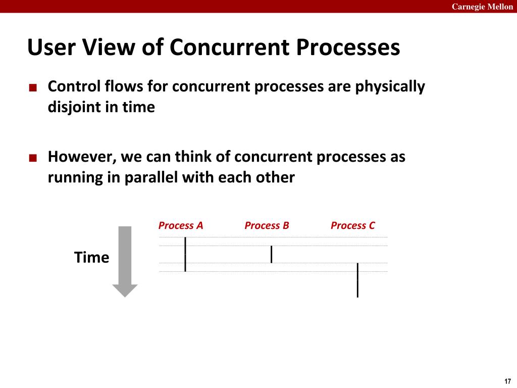 User View of Concurrent Processes • Control flows for concurrent processes are physically disjoint in time • However, we can think of concurrent processes as running in parallel with each other Process A Process B Process C Time