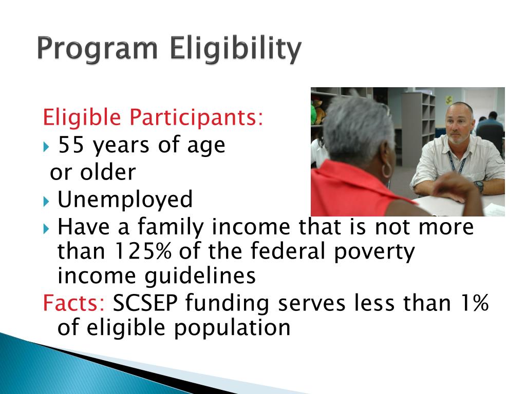 Program Eligibility Eligible Participants: • 55 years of age or older • Unemployed • Have a family income that is not more than 125% of the federal poverty income guidelines Facts: SCSEP funding serves less than 1% of eligible population