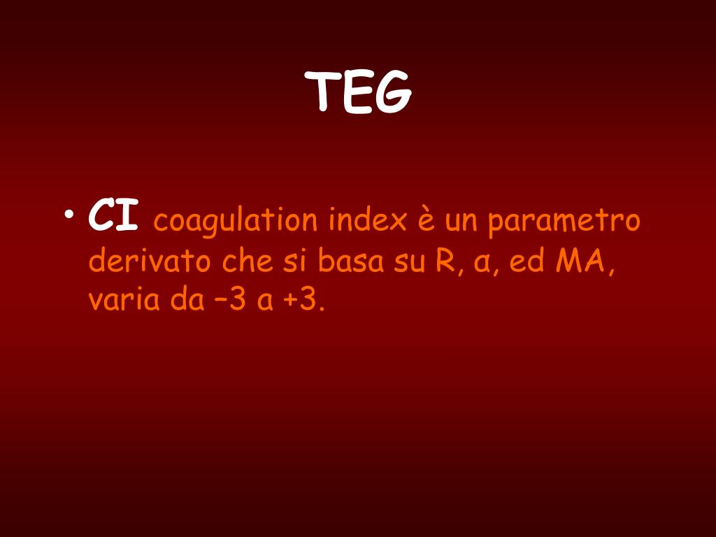 TEG • CIcoagulation index è un parametro derivato che si basa su R, α, ed MA, varia da –3 a +3.