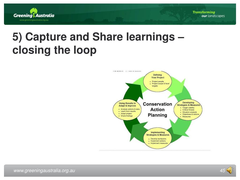 1. Objectives & Strategies 2. Inputs (actions) 3. Outputs (consequences) 4. Outcomes (consequences) Monitoring starts at the beginning Start here!! • Measured and reported at 4 scales: • National • State/Territory • Landscape • Site/project *GA Board May ‘09