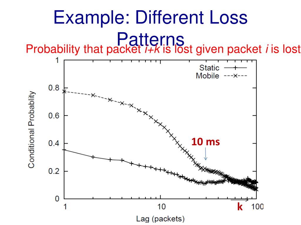 Example: Different Loss Patterns Probability that packet i+k is lost given packet iis lost 10 ms k