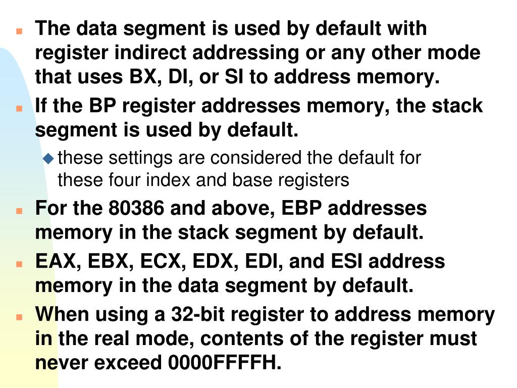 The data segment is used by default with register indirect addressing or any other mode that uses BX, DI, or SI to address memory. • If the BP register addresses memory, the stack segment is used by default. • these settings are considered the default forthese four index and base registers • For the 80386 and above, EBP addresses memory in the stack segment by default. • EAX, EBX, ECX, EDX, EDI, and ESI address memory in the data segment by default. • When using a 32-bit register to address memory in the real mode, contents of the register must never exceed 0000FFFFH.