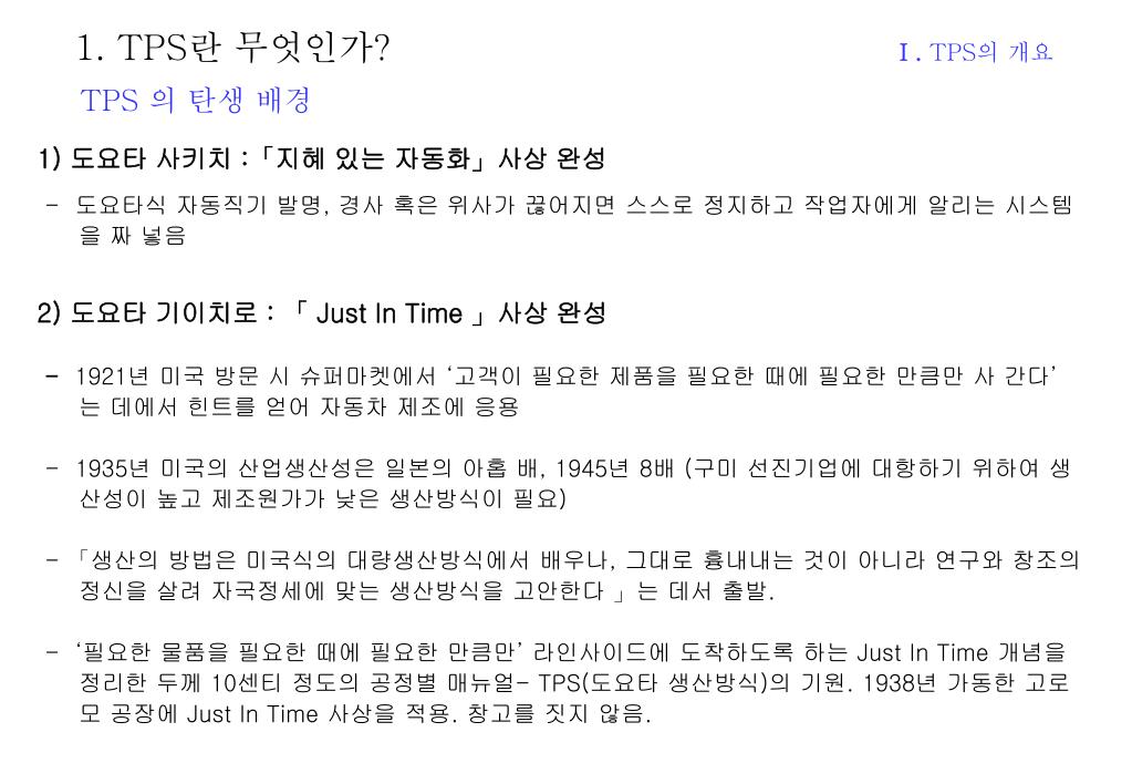 1. TPS란 무엇인가? Ⅰ. TPS의 개요 TPS 의 탄생 배경 1) 도요타 사키치 :「지혜 있는 자동화」사상 완성 - 도요타식 자동직기 발명, 경사 혹은 위사가 끊어지면 스스로 정지하고 작업자에게 알리는 시스템을 짜 넣음 2) 도요타 기이치로 : 「 Just In Time 」사상 완성 - 1921년 미국 방문 시 슈퍼마켓에서 ‘고객이 필요한 제품을 필요한 때에 필요한 만큼만 사 간다’ 는 데에서 힌트를 얻어 자동차 제조에 응용 - 1935년 미국의 산업생산성은 일본의 아홉 배, 1945년 8배 (구미 선진기업에 대항하기 위하여 생산성이 높고 제조원가가 낮은 생산방식이 필요) - 「생산의 방법은 미국식의 대량생산방식에서 배우나, 그대로 흉내내는 것이 아니라 연구와 창조의 정신을 살려 자국정세에 맞는 생산방식을 고안한다 」는 데서 출발. - ‘필요한 물품을 필요한 때에 필요한 만큼만’ 라인사이드에 도착하도록 하는 Just In Time 개념을 정리한 두께 10센티 정도의 공정별매뉴얼- TPS(도요타 생산방식)의 기원. 1938년 가동한 고로모 공장에 Just In Time 사상을 적용. 창고를 짓지 않음.