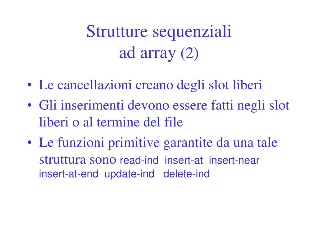Strutture sequenziali ad array (2) • Le cancellazioni creano degli slot liberi • Gli inserimenti devono essere fatti negli slot liberi o al termine del file • Le funzioni primitive garantite da una tale struttura sono read-ind insert-at insert-near insert-at-end update-ind delete-ind