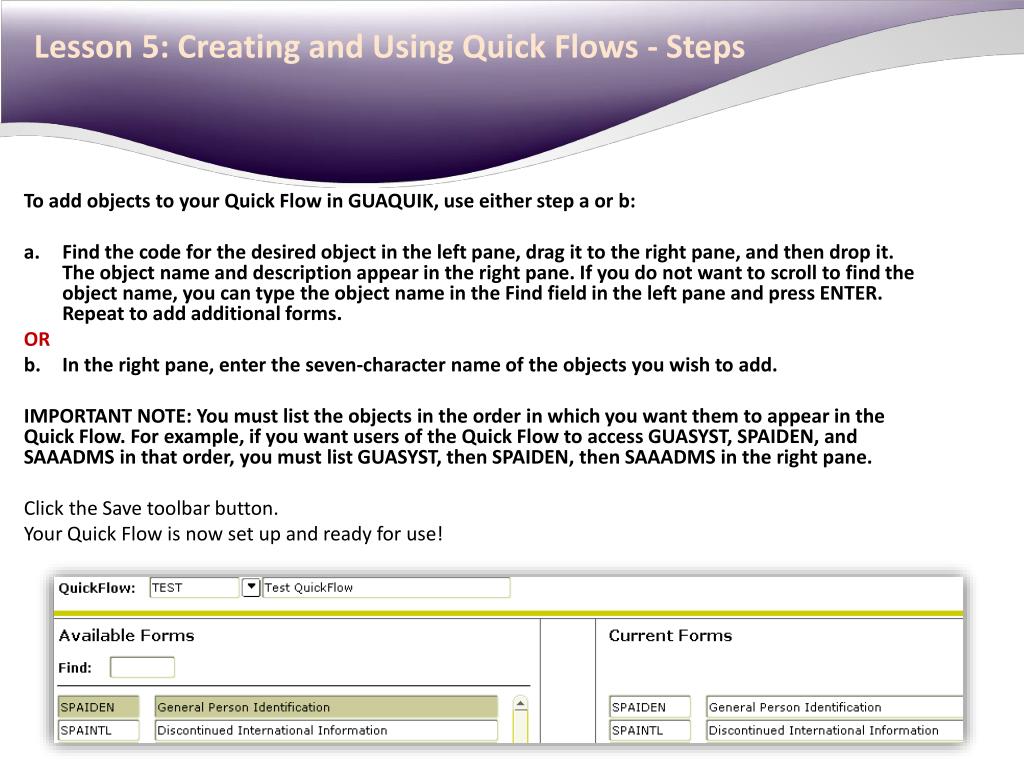 Lesson 5: Creating and Using Quick Flows - Steps To add objects to your Quick Flow in GUAQUIK, use either step a or b: a. Find the code for the desired object in the left pane, drag it to the right pane, and then drop it. The object name and description appear in the right pane. If you do not want to scroll to find the object name, you can type the object name in the Find field in the left pane and press ENTER. Repeat to add additional forms. OR b. In the right pane, enter the seven-character name of the objects you wish to add. IMPORTANT NOTE: You must list the objects in the order in which you want them to appear in the Quick Flow. For example, if you want users of the Quick Flow to access GUASYST, SPAIDEN, and SAAADMS in that order, you must list GUASYST, then SPAIDEN, then SAAADMS in the right pane. Click the Save toolbar button. Your Quick Flow is now set up and ready for use!