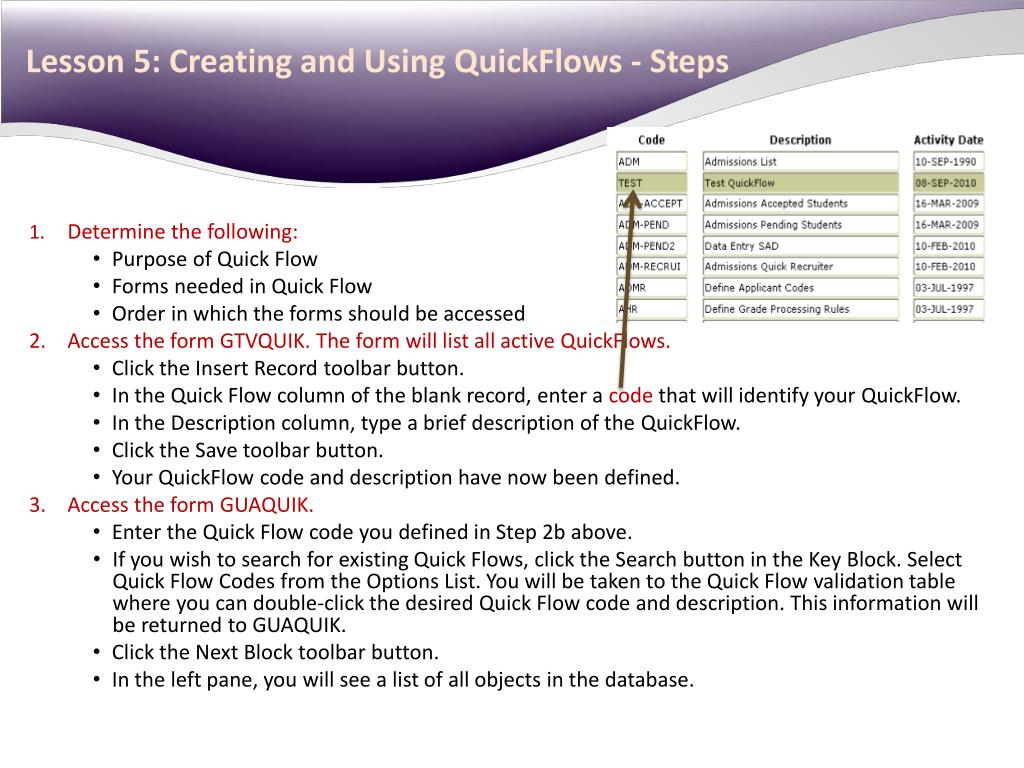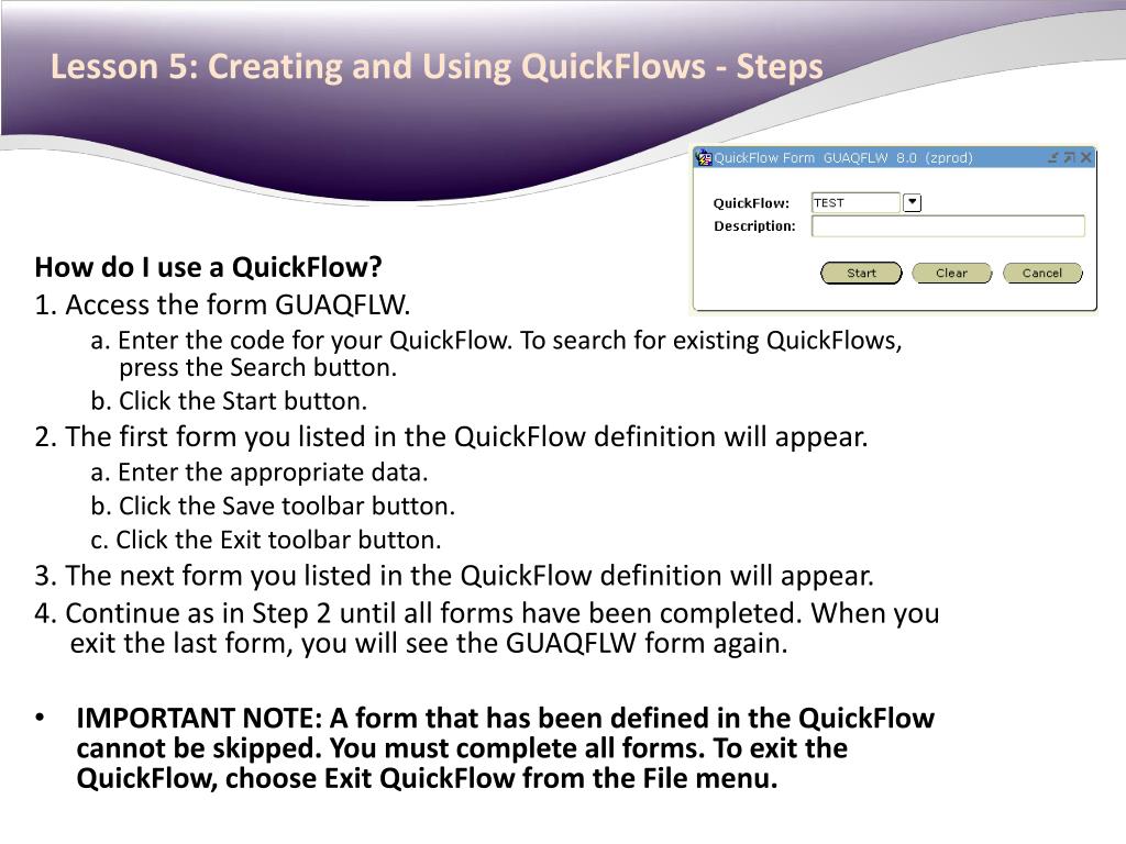 Lesson 5: Creating and Using QuickFlows What is a Quick Flow? A Quick Flow in Banner allows you to access multiple forms in a specific sequence. When is a Quick Flow useful? A Quick Flow is useful when your job function repeatedly requires you to process several forms in a specific order to complete a task. Once a Quick Flow is set up, you need only to access the QuickFlow, and then all forms in the Quick Flow will open in the order specified in setup. What are the forms used in setting up or using QuickFlows? GTVQUIK—defines the Quick Flow code and description GUAQUIK—defines the forms in the Quick Flow and the sequence in which the forms are processed GUAQFLW—allows you to enter the identifier defined in GUAQUIK to execute the Quick Flow
