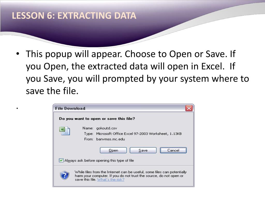 LESSON 6: EXTRACTING DATA • This popup will appear. Choose to Open or Save. If you Open, the extracted data will open in Excel. If you Save, you will prompted by your system where to save the file. .