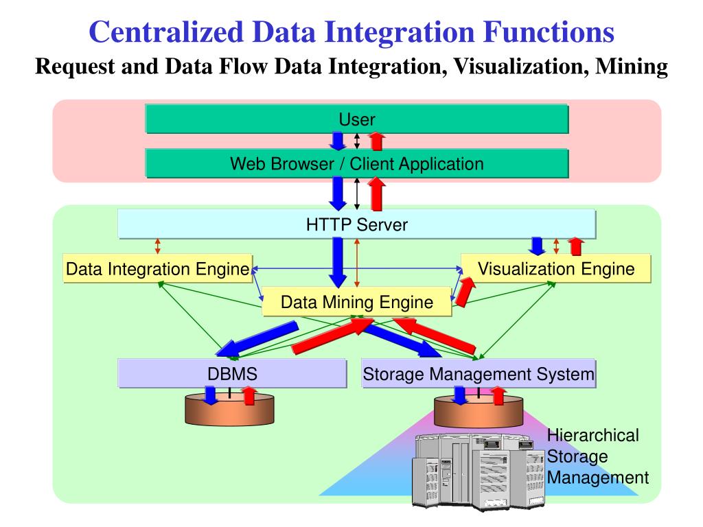 User Web Browser / Client Application HTTP Server Data Integration Engine Visualization Engine Data Mining Engine DBMS Storage Management System Hierarchical Storage Management Centralized Data Integration FunctionsRequest and Data Flow Data Integration, Visualization, Mining