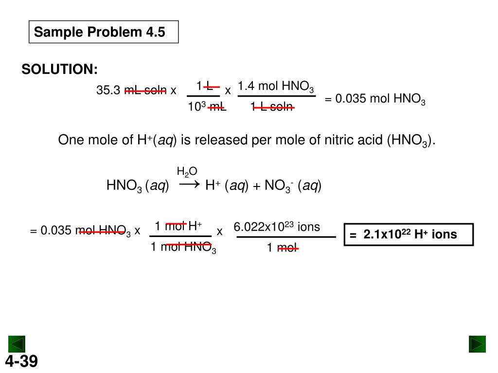 1.4 mol HNO3 x 1 L soln 1 L 35.3 mL soln x 103 mL = 0.035 mol HNO3 x H2O HNO3 (aq)→H+ (aq) + NO3- (aq) 1 mol H+ 6.022x1023 ions x 1 mol HNO3 1 mol Sample Problem 4.5 SOLUTION: = 0.035 mol HNO3 One mole of H+(aq) is released per mole of nitric acid (HNO3). = 2.1x1022 H+ ions