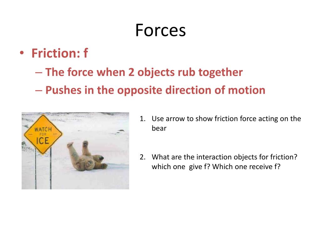Forces • Friction: f • The force when 2 objects rub together • Pushes in the opposite direction of motion Use arrow to show friction force acting on the bear What are the interaction objects for friction? which one give f? Which one receive f?