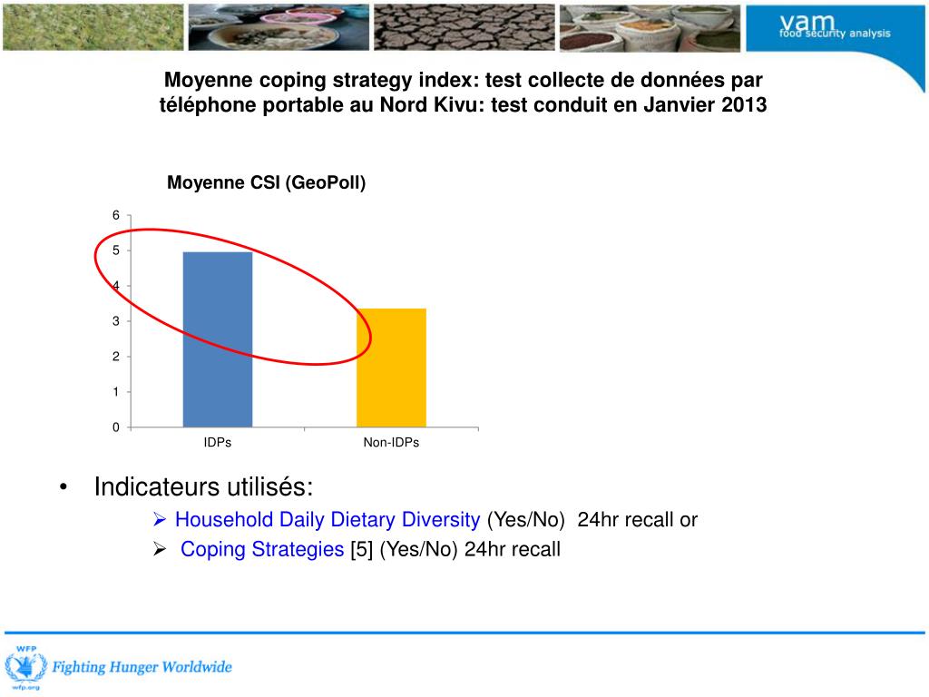 Moyenne coping strategy index: test collecte de données par téléphone portable au Nord Kivu: test conduit en Janvier 2013 • Indicateursutilisés: • Household Daily Dietary Diversity (Yes/No) 24hr recall or • Coping Strategies [5] (Yes/No) 24hr recall