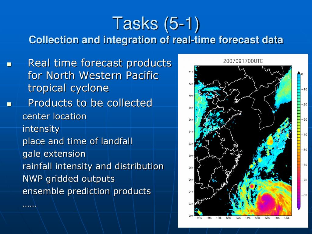 Tasks (5-1)Collection and integration of real-time forecast data • Real time forecast products for North Western Pacific tropical cyclone • Products to be collected center location intensity place and time of landfall gale extension rainfall intensity and distribution NWP gridded outputs ensemble prediction products ……
