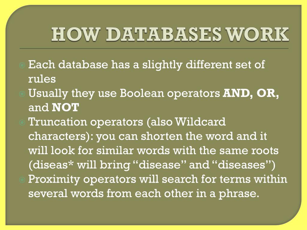HOW DATABASES WORK Each database has a slightly different set of rules Usually they use Boolean operators AND, OR, and NOT Truncation operators (also Wildcard characters): you can shorten the word and it will look for similar words with the same roots (diseas* will bring “disease” and “diseases”) Proximity operators will search for terms within several words from each other in a phrase.
