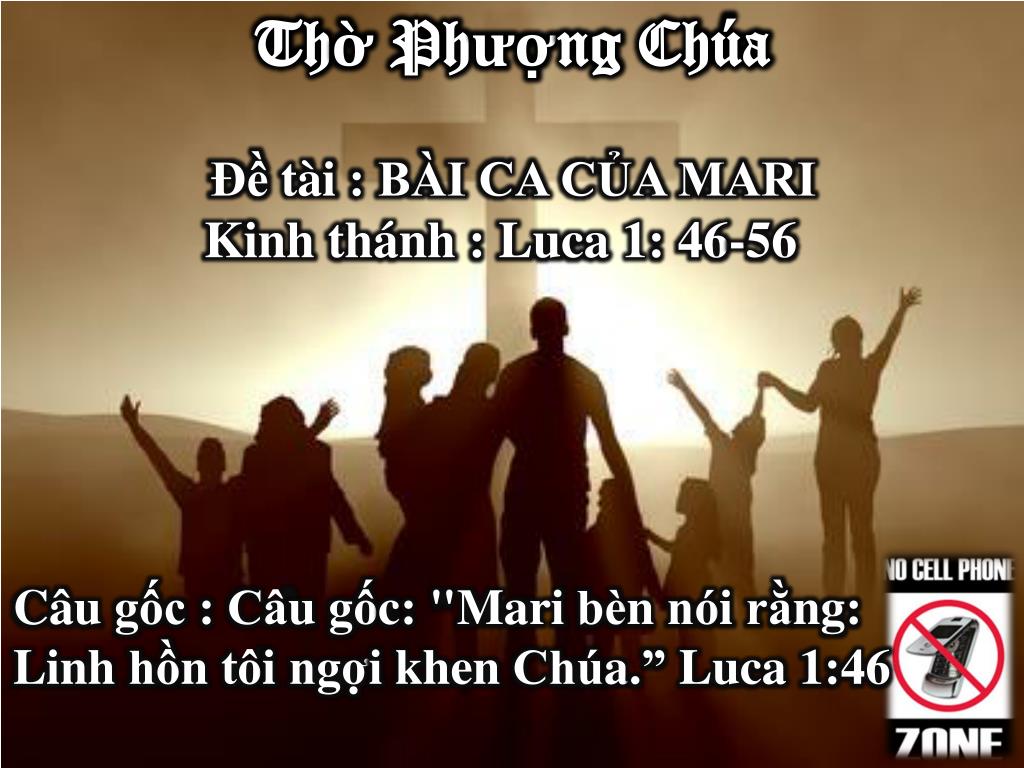 Thờ Phượng Chúa. Đề tài : BÀI CA CỦA MARI Kinh thánh : Luca 1: 46-56 Câu gốc : Câu gốc : "Mari bèn nói rằng : Linh hồn tôi ngợi khen Chúa . ” Luca 1 :46. Thi-thiên 1:1-6.