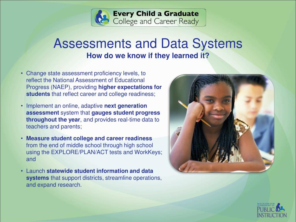 Assessments and Data SystemsHow do we know if they learned it? • Change state assessment proficiency levels, to reflect the National Assessment of Educational Progress (NAEP), providing higher expectations for students that reflect career and college readiness; • Implement an online, adaptive next generation assessment system that gauges student progress throughout the year, and provides real-time data to teachers and parents; • Measure student college and career readiness from the end of middle school through high school using the EXPLORE/PLAN/ACT tests and WorkKeys; and • Launch statewide student information and data systems that support districts, streamline operations, and expand research.