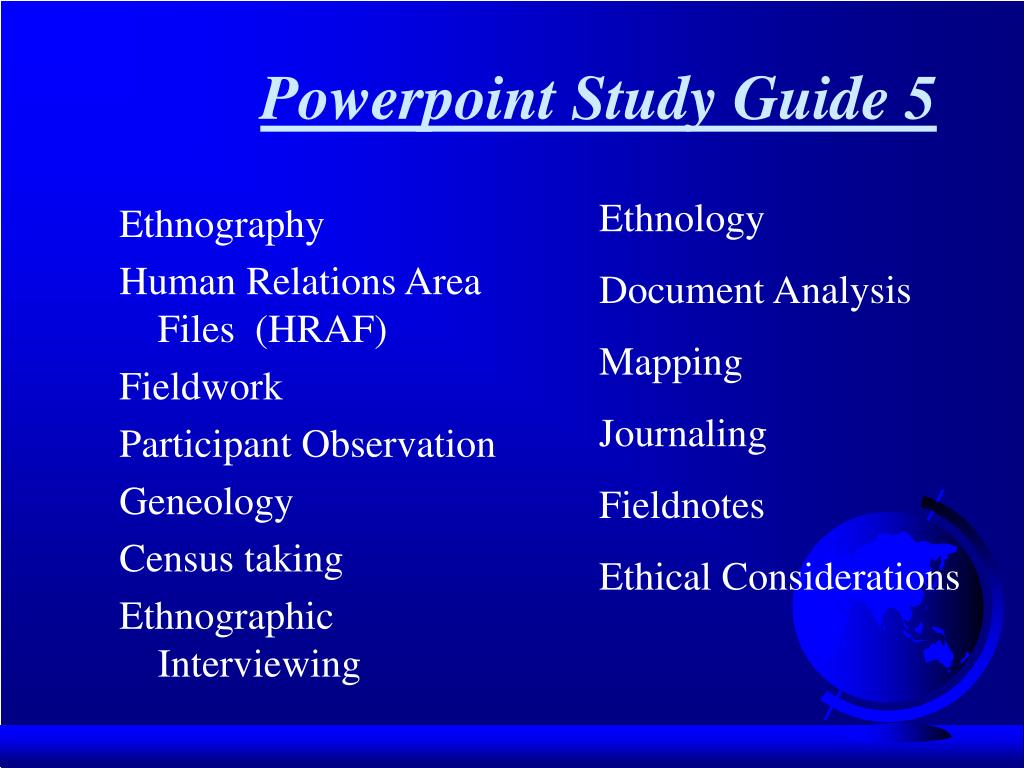 Powerpoint Study Guide 5 Ethnography Human Relations Area Files (HRAF) Fieldwork Participant Observation Geneology Census taking Ethnographic Interviewing Ethnology Document Analysis Mapping Journaling Fieldnotes Ethical Considerations