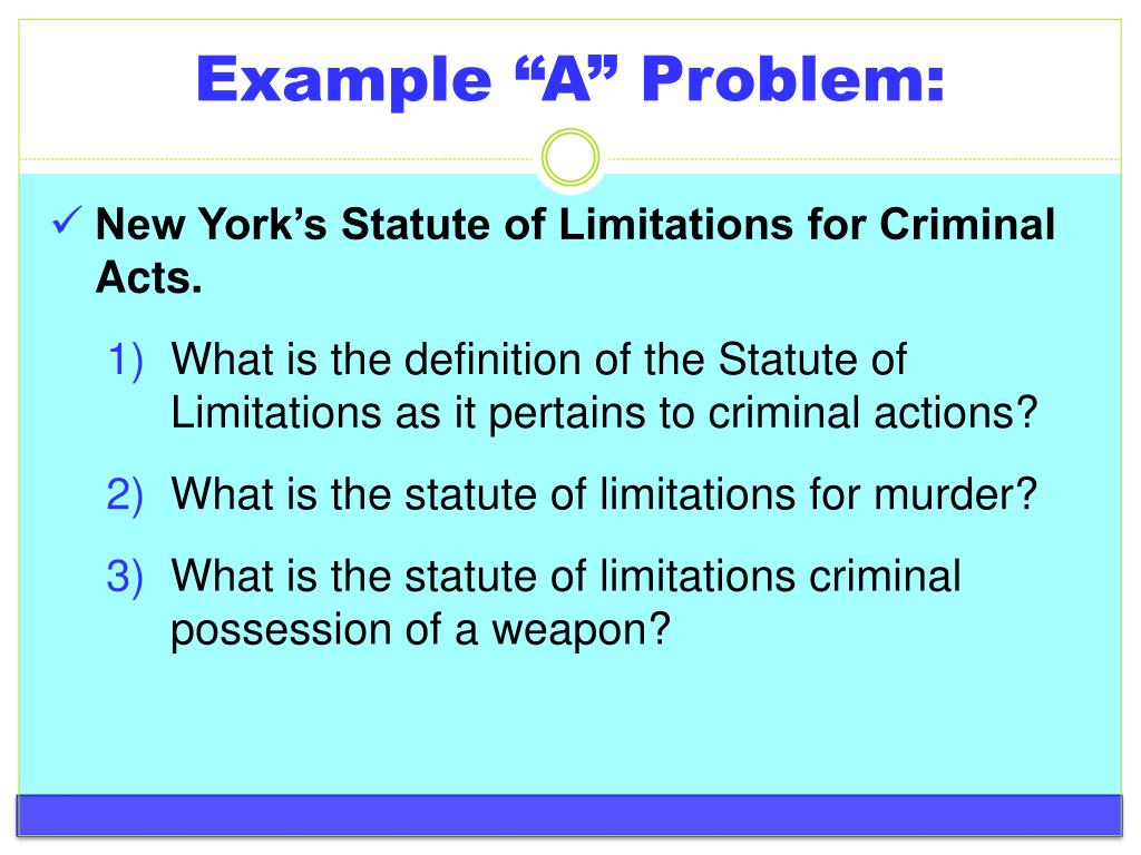 Example “A” Problem: • New York’s Statute of Limitations for Criminal Acts. • What is the definition of the Statute of Limitations as it pertains to criminal actions? • What is the statute of limitations for murder? • What is the statute of limitations criminal possession of a weapon?