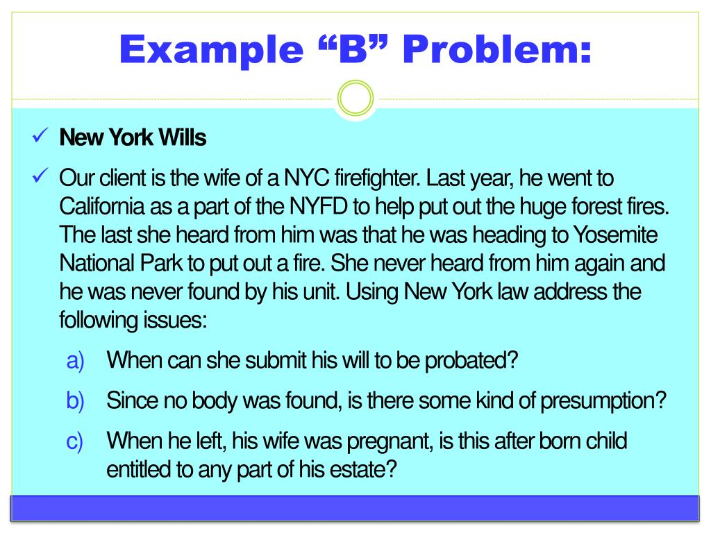 Example “B” Problem: • New York Wills • Our client is the wife of a NYC firefighter. Last year, he went to California as a part of the NYFD to help put out the huge forest fires. The last she heard from him was that he was heading to Yosemite National Park to put out a fire. She never heard from him again and he was never found by his unit. Using New York law address the following issues: • When can she submit his will to be probated? • Since no body was found, is there some kind of presumption? • When he left, his wife was pregnant, is this after born child entitled to any part of his estate?