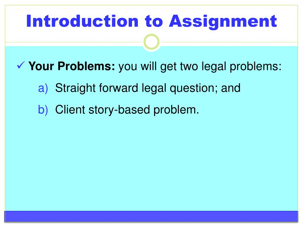 Introduction to Assignment • Your Problems: you will get two legal problems: • Straight forward legal question; and • Client story-based problem.