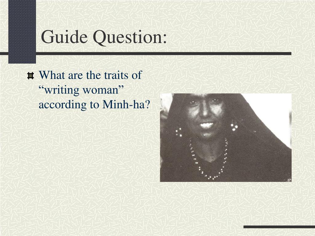 Guide Question: • What are the traits of “writing woman” according to Minh-ha?