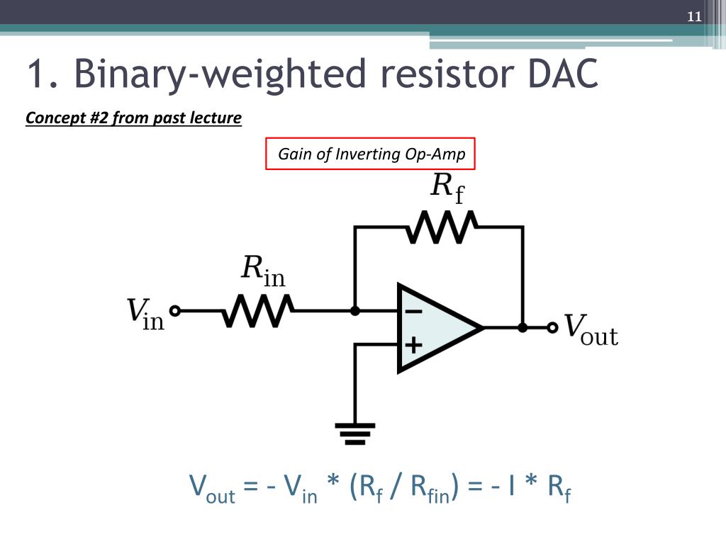 1. Binary-weighted resistor DAC Concept #2 from past lecture Gain of Inverting Op-Amp • Vout = -Vin * (Rf /Rfin) = - I * Rf