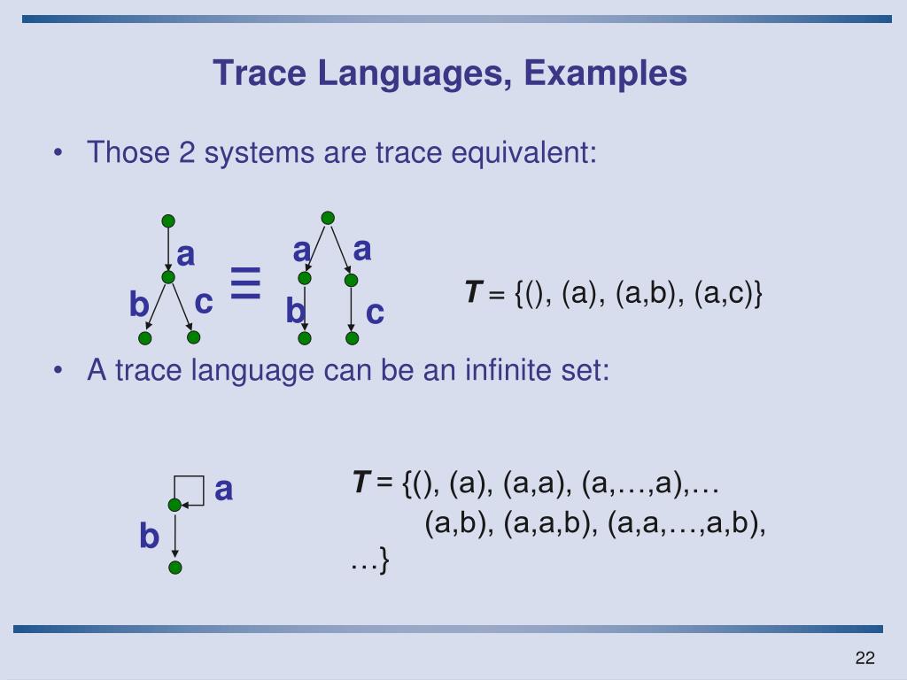 a a a ≡ c b b c a b Trace Languages, Examples • Those 2 systems are trace equivalent: • A trace language can be an infinite set: T = {(), (a), (a,b), (a,c)} T = {(), (a), (a,a), (a,…,a),… (a,b), (a,a,b), (a,a,…,a,b), …}