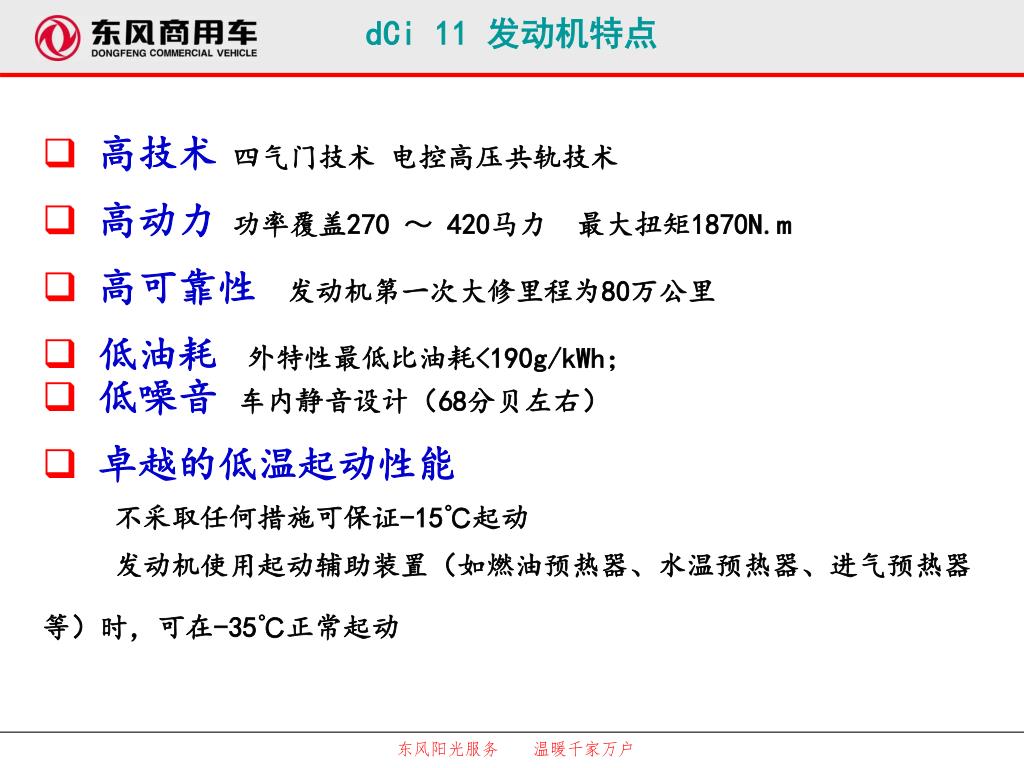 dCi 11 发动机特点 • 高技术 四气门技术 电控高压共轨技术 • 高动力 功率覆盖270 ~ 420马力 最大扭矩1870N.m • 高可靠性 发动机第一次大修里程为80万公里 • 低油耗 外特性最低比油耗<190g/kWh; • 低噪音 车内静音设计(68分贝左右) • 卓越的低温起动性能 不采取任何措施可保证-15℃起动 发动机使用起动辅助装置(如燃油预热器、水温预热器、进气预热器等)时,可在-35℃正常起动