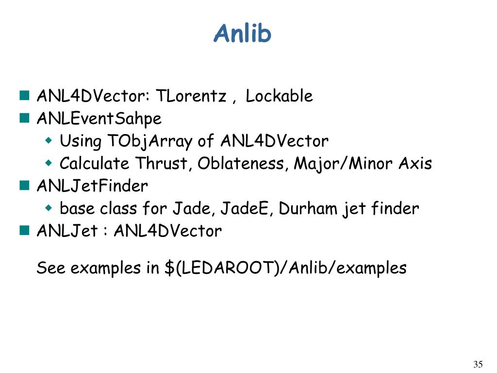 Anlib • ANL4DVector: TLorentz , Lockable • ANLEventSahpe • Using TObjArray of ANL4DVector • Calculate Thrust, Oblateness, Major/Minor Axis • ANLJetFinder • base class for Jade, JadeE, Durham jet finder • ANLJet : ANL4DVectorSee examples in $(LEDAROOT)/Anlib/examples