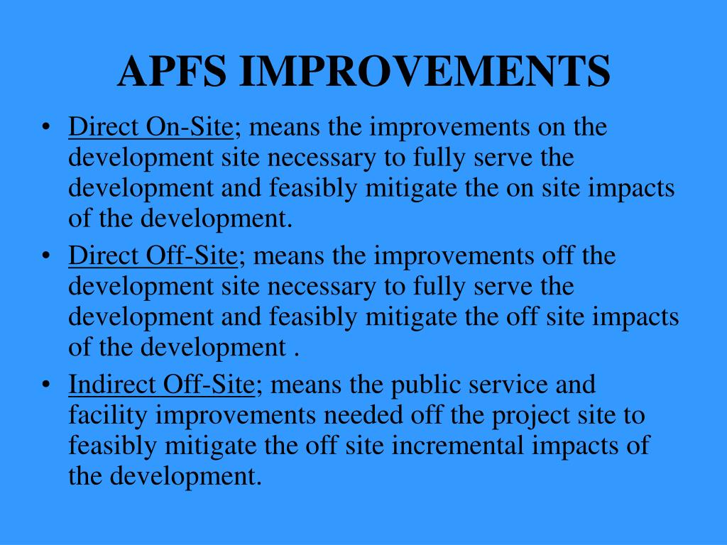 APFS IMPROVEMENTS • Direct On-Site; means the improvements on the development site necessary to fully serve the development and feasibly mitigate the on site impacts of the development. • Direct Off-Site; means the improvements off the development site necessary to fully serve the development and feasibly mitigate the off site impacts of the development . • Indirect Off-Site; means the public service and facility improvements needed off the project site to feasibly mitigate the off site incremental impacts of the development.