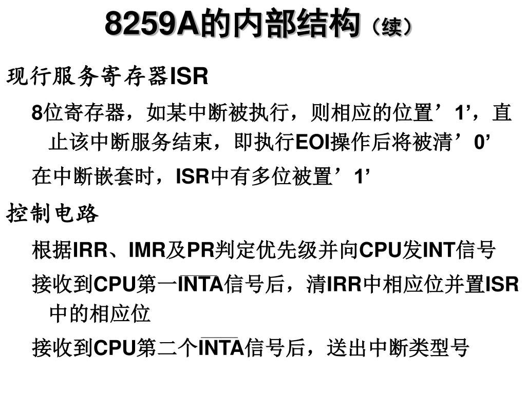 8259A的内部结构(续) • 现行服务寄存器ISR • 8位寄存器,如某中断被执行,则相应的位置’1’,直止该中断服务结束,即执行EOI操作后将被清’0’ • 在中断嵌套时,ISR中有多位被置’1’ • 控制电路 • 根据IRR、IMR及PR判定优先级并向CPU发INT信号 • 接收到CPU第一INTA信号后,清IRR中相应位并置ISR中的相应位 • 接收到CPU第二个INTA信号后,送出中断类型号