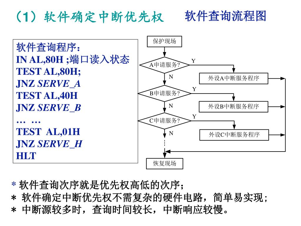 (1)软件确定中断优先权 • 软件法是在CPU响应中断后,用软件查询确定哪个中断源申请中断,先被查询的先响应。 • 查询次序决定了中断优先权次序,最先被查询的中断源具有最高的优先权。