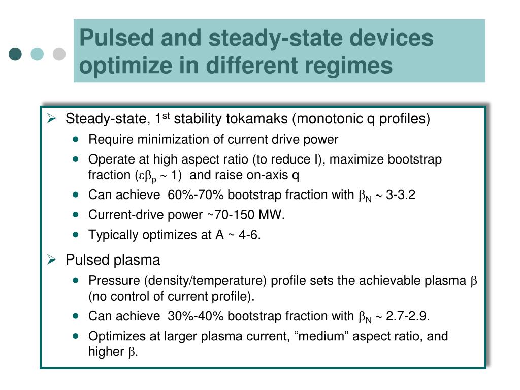 Pulsed and steady-state devices optimize in different regimes • Steady-state, 1st stability tokamaks (monotonic q profiles) • Require minimization of current drive power • Operate at high aspect ratio (to reduce I), maximize bootstrap fraction (ebp 1) and raise on-axis q • Can achieve 60%-70% bootstrap fraction with bN 3-3.2 • Current-drive power ~70-150 MW. • Typically optimizes at A ~ 4-6. • Pulsed plasma • Pressure (density/temperature) profile sets the achievable plasma b (no control of current profile). • Can achieve 30%-40% bootstrap fraction with bN 2.7-2.9. • Optimizes at larger plasma current, “medium” aspect ratio, and higher b.