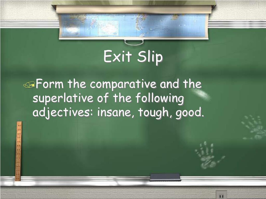 Exit Slip • Form the comparative and the superlative of the following adjectives: insane, tough, good.