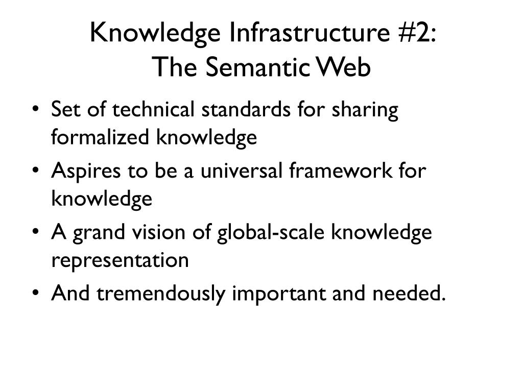 Knowledge Infrastructure #2: The Semantic Web • Set of technical standards for sharing formalized knowledge • Aspires to be a universal framework for knowledge • A grand vision of global-scale knowledge representation • And tremendously important and needed.