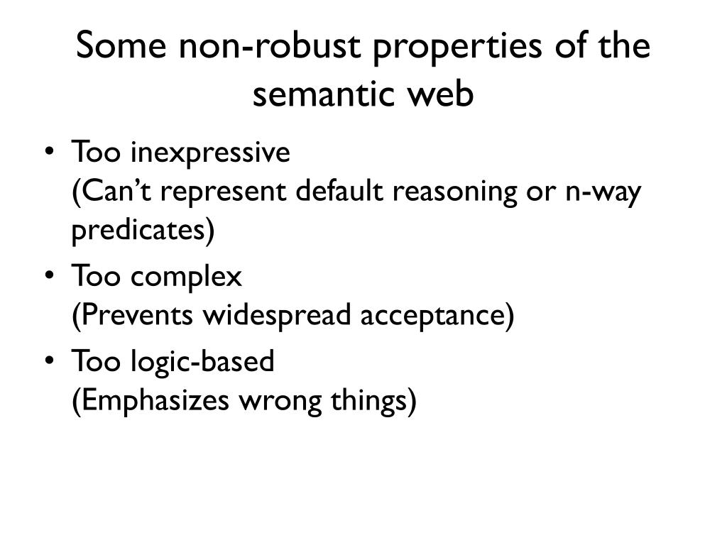 Some non-robust properties of the semantic web • Too inexpressive(Can’t represent default reasoning or n-way predicates) • Too complex(Prevents widespread acceptance) • Too logic-based(Emphasizes wrong things)