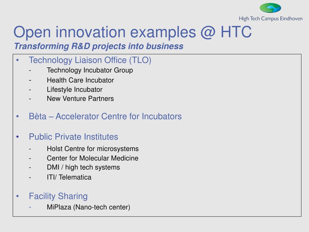 Open innovation examples @ HTCTransforming R&D projects into business • Technology Liaison Office (TLO) • - Technology Incubator Group • - Health Care Incubator • - Lifestyle Incubator • - New Venture Partners • Bèta – Accelerator Centre for Incubators • Public Private Institutes • -Holst Centre for microsystems • - Center for Molecular Medicine • - DMI / high tech systems • - ITI/ Telematica • Facility Sharing • - MiPlaza (Nano-tech center)