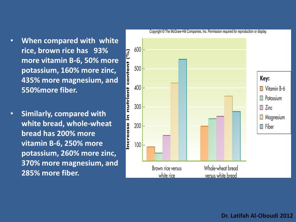 When compared with white rice, brown rice has 93% more vitamin B-6, 50% more potassium, 160% more zinc, 435% more magnesium, and 550%more fiber. • Similarly, compared with white bread, whole-wheat bread has 200% more vitamin B-6, 250% more potassium, 260% more zinc, 370% more magnesium, and 285% more fiber. Dr. Latifah Al-Oboudi2012