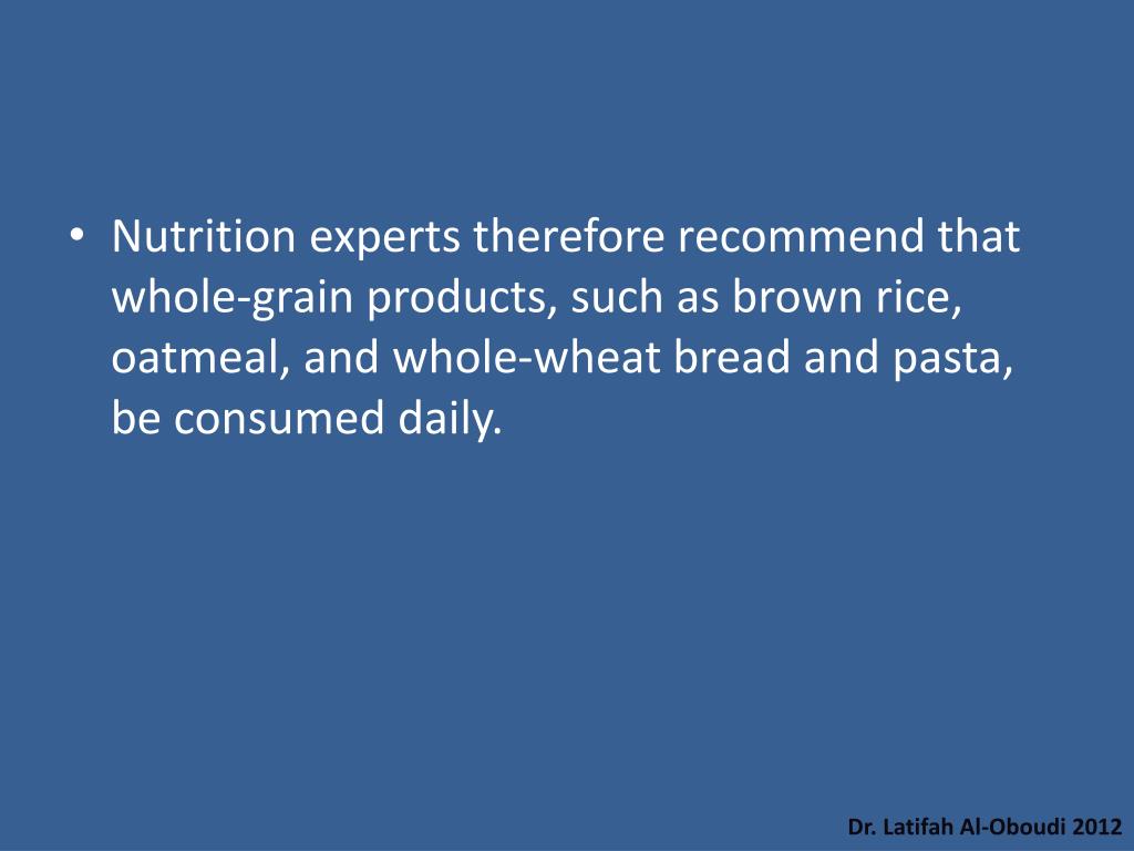 Nutrition experts therefore recommend that whole-grain products, such as brown rice, oatmeal, and whole-wheat bread and pasta, be consumed daily. Dr. Latifah Al-Oboudi2012