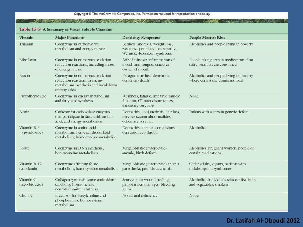 Water-Soluble Vitamin Overview • Retention of the B-vitamins and vitamin C is greatest in foods that are prepared by steaming, stir-frying, and microwaving. These cooking methods limit exposure to heat and water. • Fruits and vegetables are especially important sources of many vitamins. Dr. Latifah Al-Oboudi2012
