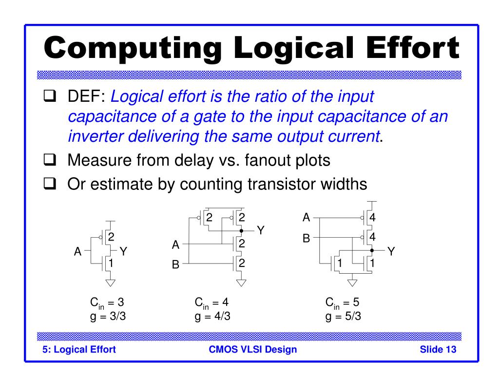 Introduction to CMOS VLSI Design Lecture 5: Logical Effort. David Harris Harvey Mudd College Spring 2004. Outline. Introduction Delay in a Logic Gate Multistage Logic Networks Choosing the Best Number of Stages Example Summary. Introduction.