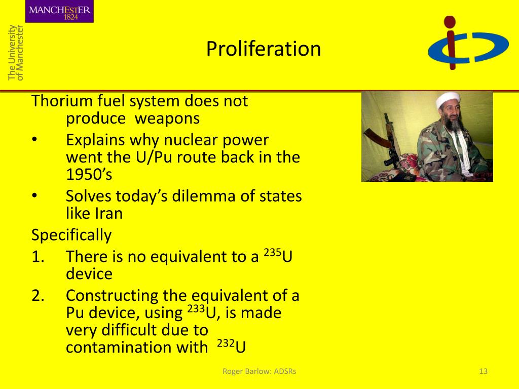 Proliferation Thorium fuel system does not produce weapons • Explains why nuclear power went the U/Pu route back in the 1950’s • Solves today’s dilemma of states like Iran Specifically • There is no equivalent to a 235U device • Constructing the equivalent of a Pu device, using 233U, is made very difficult due to contamination with 232U Roger Barlow: ADSRs 13