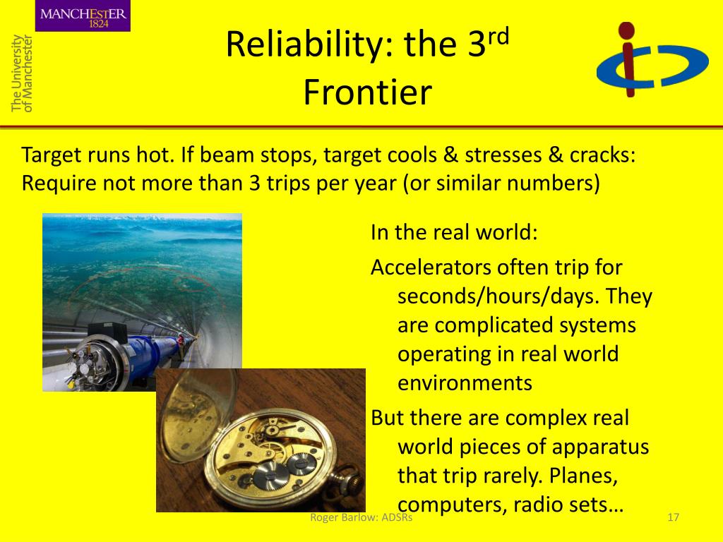 Reliability: the 3rd Frontier Target runs hot. If beam stops, target cools & stresses & cracks: Require not more than 3 trips per year (or similar numbers) In the real world: Accelerators often trip for seconds/hours/days. They are complicated systems operating in real world environments But there are complex real world pieces of apparatus that trip rarely. Planes, computers, radio sets… Roger Barlow: ADSRs 17