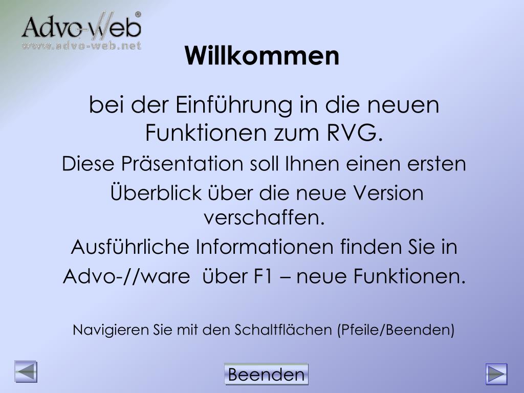 Willkommen. bei der Einführung in die neuen Funktionen zum RVG. Diese Präsentation soll Ihnen einen ersten Überblick über die neue Version verschaffen. Ausführliche Informationen finden Sie in Advo-//ware über F1 – neue Funktionen. Navigieren Sie mit den Schaltflächen (Pfeile/Beenden).