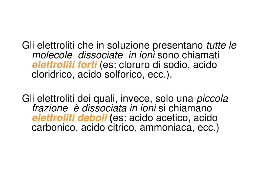 Gli elettroliti che in soluzione presentano tutte le molecole dissociate in ioni sono chiamati elettroliti forti(es: cloruro di sodio, acido cloridrico, acido solforico, ecc.). Gli elettroliti dei quali, invece, solo una piccola frazione èdissociata in ioni sichiamano elettroliti deboli (es: acido acetico, acido carbonico, acido citrico, ammoniaca, ecc.)