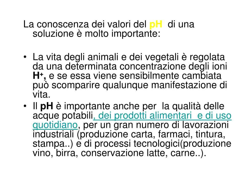 La conoscenza dei valori del pH di una soluzione è molto importante: • La vita degli animali e dei vegetali è regolata da una determinata concentrazione degli ioni H+, e se essa viene sensibilmente cambiata può scomparire qualunque manifestazione di vita. • Il pH è importante anche per la qualità delle acque potabili, dei prodotti alimentari e di uso quotidiano, per un gran numero di lavorazioni industriali (produzione carta, farmaci, tintura, stampa..) e di processi tecnologici(produzione vino, birra, conservazione latte, carne..).