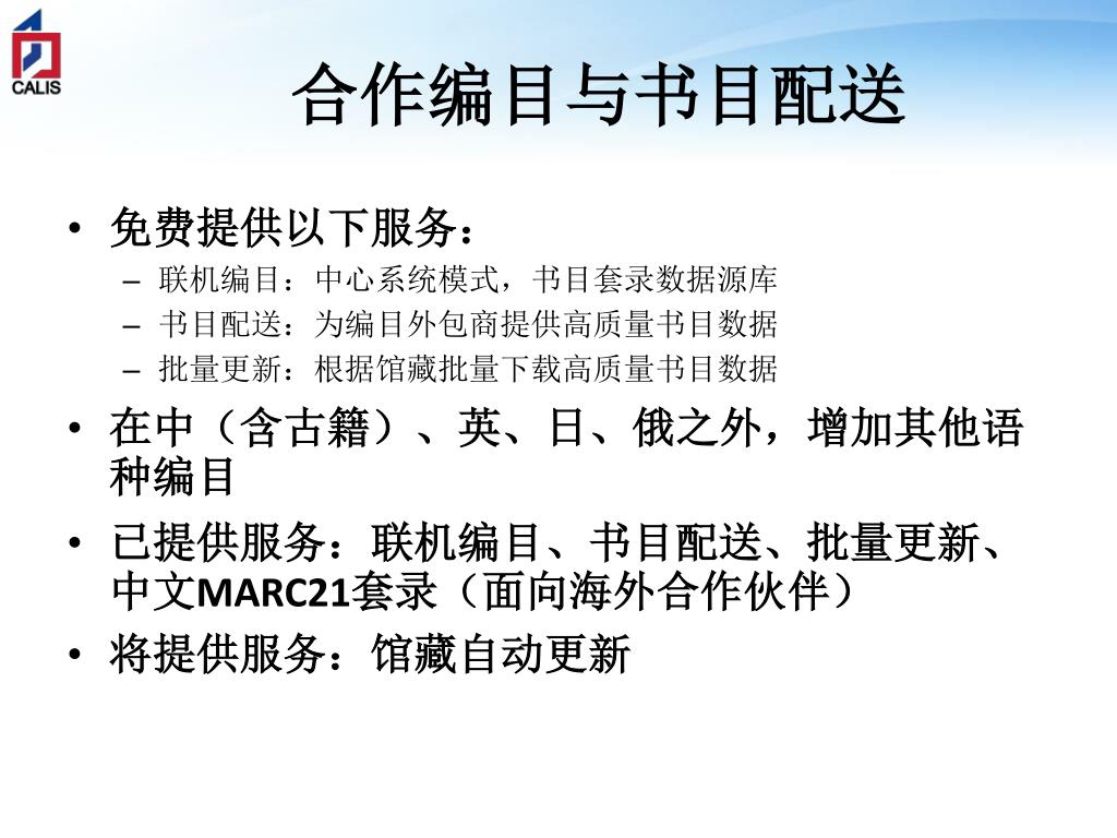 合作编目与书目配送 • 免费提供以下服务: • 联机编目:中心系统模式,书目套录数据源库 • 书目配送:为编目外包商提供高质量书目数据 • 批量更新:根据馆藏批量下载高质量书目数据 • 在中(含古籍)、英、日、俄之外,增加其他语种编目 • 已提供服务:联机编目、书目配送、批量更新、中文MARC21套录(面向海外合作伙伴) • 将提供服务:馆藏自动更新
